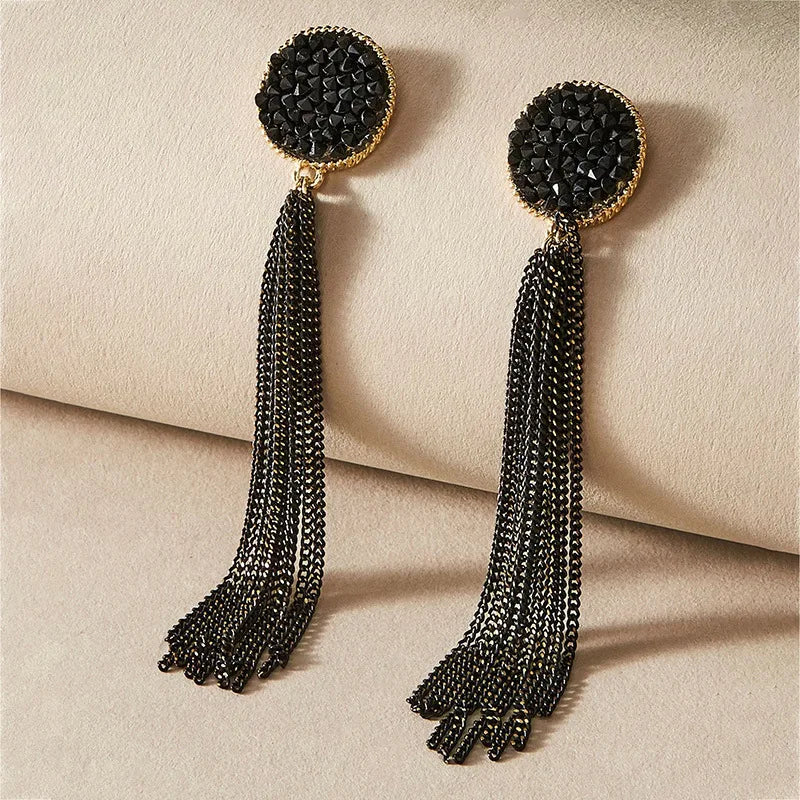 O Brinco Fiorella é ideal para compor looks noturnos com sua base redonda cravejada de pedras pretas brilhantes e correntes longas e finas criando movimento e efeito glamouroso ao balançar.