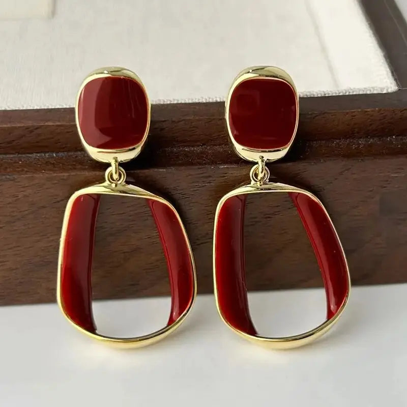 O Brinco Luzia realça a beleza do seu rosto transmitindo confiança e charme. Combinação do design moderno com um toque de sofisticação. Suas formas geométricas em dourado contrastam com o vermelho intenso, criando uma peça marcante e cheia de personalidade.